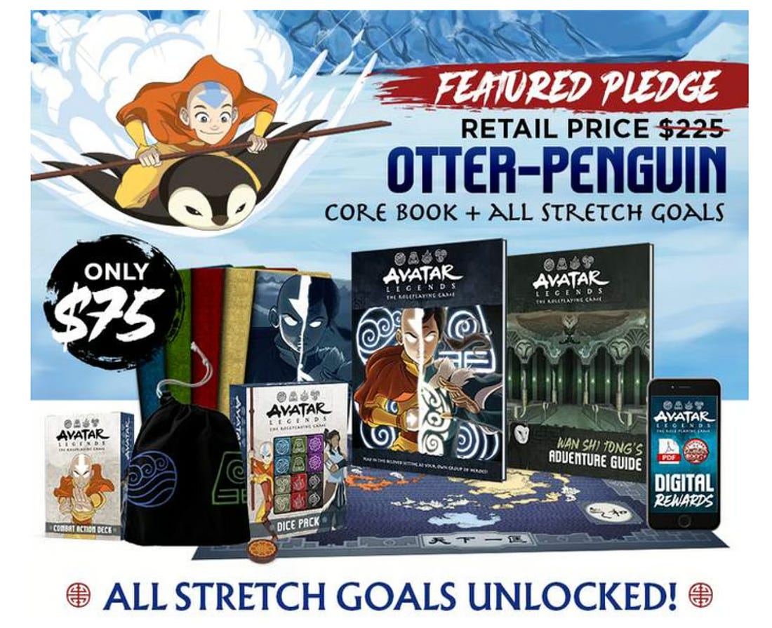 The great IRONY of a $9.53 million roleplaying gameA reminder that expensive games can't deliver on everything...I have a great love for the show Avatar The Last Airbender. As do many people. Get this: it’s number SEVEN on the list of top shows of ALL TIME on IMDb. That's the decision of the ongoing world wide web popularity contest. And Avatar, a kids show from 2005 on Nickelodeon, made the top 10. People go ga-ga for this one. So much so that when Magpie Games launched a Kickstarter in 2021 for an official Avatar roleplaying game, it was MASSIVE. Record-breaking massive. Top Kickstarters EVER massive. Over EIGHTY THOUSAND PEOPLE opened their wallets and spent over NINE MILLION DOLLARS to get their hands on these books. I was one of those people. I spent the $75 plus shipping. I got two books, five note-booklets, dice, cards, a cloth map, a dice bag, and a White Lotus tile. Grinning ear-to-ear when it arrived. Glorious. Then I read the game. My review in one word? S'good! Absolutely, it's a game that "does Avatar". The world is there, the character and moves work, the layout and design are superb. It's a very Avatar roleplaying game. Undeniably professional, official stuff. However, something very much did NOT pass the sniff test. To back up, there are a LOT of RPGs with direct reference to movies, TV shows, and books: Star Wars, The Lord of the Rings, Conan, Ghostbusters, Aliens, Terminator, Blade Runner, James Bond, Dune, Doctor Who, Buffy the Vampire Slayer, Firefly, Star Trek, Marvel Super Heroes, Teenage Mutant Ninja Turtles, Hellboy, Wheel of Time, Call of Cthulhu, Dishonored, the list goes on. For these games, there's an obvious test to see if they hold to their source material: could the events of the source material happen IN them?
