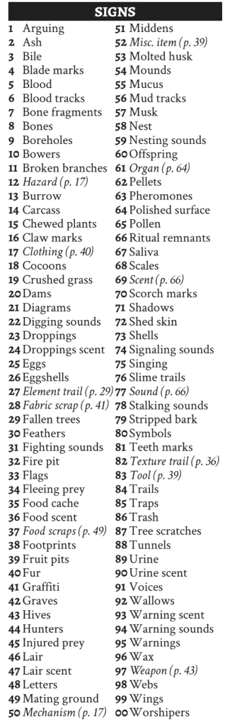First change: the company always encounters the hex’s Landmark regardless of the Wilderness Roll result. The Landmark is the static element beneath the shifting wilds and establishes the backdrop of the action. Dot one of each of these additional Landmarks on your map of the Realm while you’re at it. Now with that change, 4, 5, and 6 are “only” “empty” results. I put those in quotes because these results are when you’re meant to evoke flavor and themes, indulge the senses, and reinforce what they’ve learned (pg. 16). And also, we know that “empty” rooms in terms of classic dungeon crawling are never empty. They contain small details, flavor, and discoverables! So what if you want to tweak these empty results? Give the referee more tactile prompts for what happens next? Give the company something to react to instead of just saying “that was a nice piece of prose... so what’s the next bit of adventure?” The goal is twofold: introduce more definitive results to the wilderness roll and further obfuscate the Myths. These definitive results make it easier to referee as you just have to stick to the items you selected to have hygienic procedures. And obfuscating the Myths injects uncertainty and tension: “Is this part of the Bat myth the Seer told us about? Or something else? Let’s investigate...” Aye, therein lies more adventure and more paths to tread. The preparation is simple: to overload the wilderness roll, pick up to three items below and slot them in the three remaining sides of the d6 roll (4, 5, and 6):