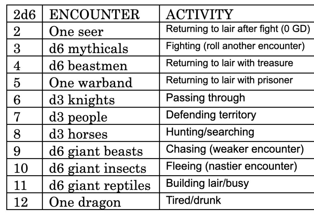 Because being out in wilderness or just travel more generally wears you down. Remember the last time you were at the airport? Did you feel like your own Vigour, Clarity, and Spirit were at their highest? Likewise, describe how the knights feel sore, or squint in the daylight, or get frustrated with their horses reins and other inconveniences. Even a slight stumble, slight backtracking, or a personal slight can bring their virtues down. SIGNEncounter the evidence of others.There are others in the world that leave their residue behind and this outcome imitates that. Signs can point to future encounters or just be some object or marking found in the wild, a non-sequitur. I’ve used the d100 table from Knave Second Edition and there are others out there. OBSTACLEEncounter a random travel obstacle.This usually comes in the form of a quick save or luck roll to see how the knights fare against things like scarce food and hidden nests and interpreting the accent of a passersby giving directions. I’ve been using the Travel Challenge Generator from Savvy Donkey Press. Free resource that calls for STR, DEX, and WIL saves which makes me think it was developed for ItO or Cairn, so some mapping onto MB’s virtues is required. It even uses d72 to determine the obstacle! ENCOUNTEREncounter a random encounter.Roll 2d6 for the encounter and activity. Optionally, you can replace the Activity roll with the d72 State table in Mythic Bastionland (check the bottom of the Knight pages). This draws from Papers Pencils, where rolling a 12 is a Dragon (named and statted for you) and rolling a 2 is a wizard. But because this is Mythic Bastionland, replace ‘wizard’ with ‘seer’: Now, to fully expand and stat these entries. To clarify, there is the number encountered and there is also a nested table in that entry. So when rolling d6 mythicals, you might roll a 5 for harpies and then roll again to see there’re 3 of them. 2- ONE SEER roll d72 in the book, accompanied by...
